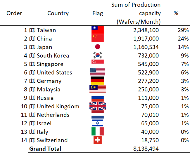 There’s probably a joke about British and American use of the word chips here, but in this article we are talking about silicon chips. Here is some stats I took 1½ years ago on which countries make them, taken from Wikipedia.